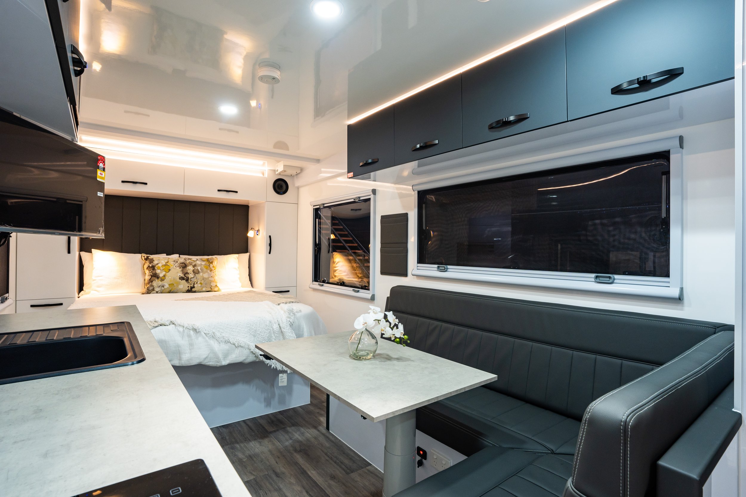Designed without a front walkthrough tunnel boot for a cleaner, more streamlined profile,. This van brings a new level of sophistication, intelligent design and touring comfort, setting a high standard for off-road caravans.